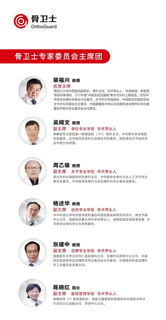 骨卫士是目前国内领先的骨科专业化综合医疗服务平台,业务发展迅速。骨科专家团队始终是骨卫士发展的基石和核心竞争力。2019年1月骨卫士专家委员会正式成立。骨卫士专家委员会设脊柱、关节、创伤、足踝、医院管理五个专业学组,在专委会主席团指导下,持续提升骨卫士体系内专业技术人员任职能力、学术水平及临床技术能力;通过召开内部外部学术会议及教育培训工作,深化专业人才培养与人才梯队建设;规划各专业学科发展,指导开展学科体系建设,提升医院管理水平及公司品牌影响力。