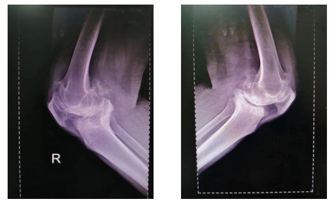 查 体:左膝活动范围20°~35°,HSS评分25分;右膝活动范围10°~30°,HSS评分20分。